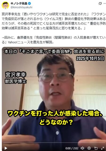 宮沢孝幸先生「(ウイルス性)肺炎の重症化予防効果はあるだろうが、その他の死因で亡くなる方が滅茶苦茶増えたのに